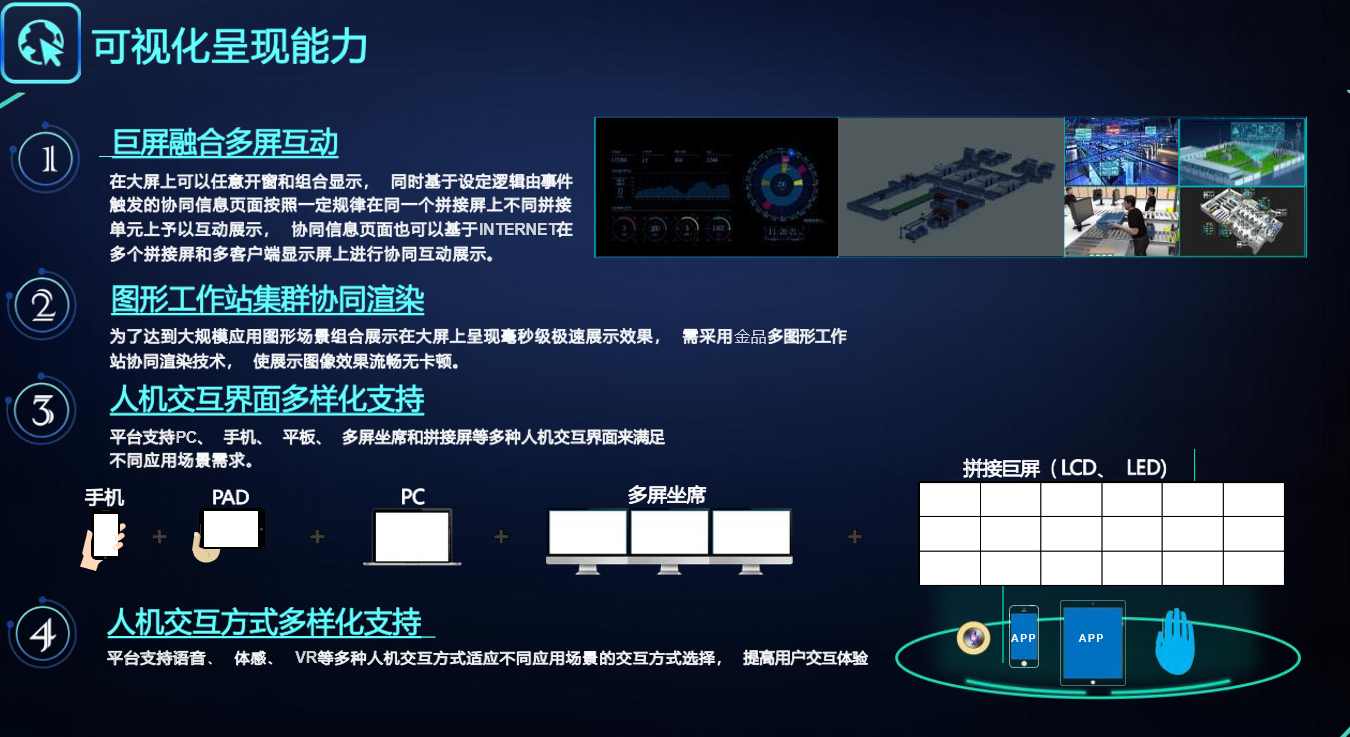 大屏可視化及自然交互:提供炫酷的用戶界面、巨屏多窗口融合、多屏互動(dòng)、多工作站實(shí)時(shí)協(xié)同渲染等技術(shù)以及自然語(yǔ)音、