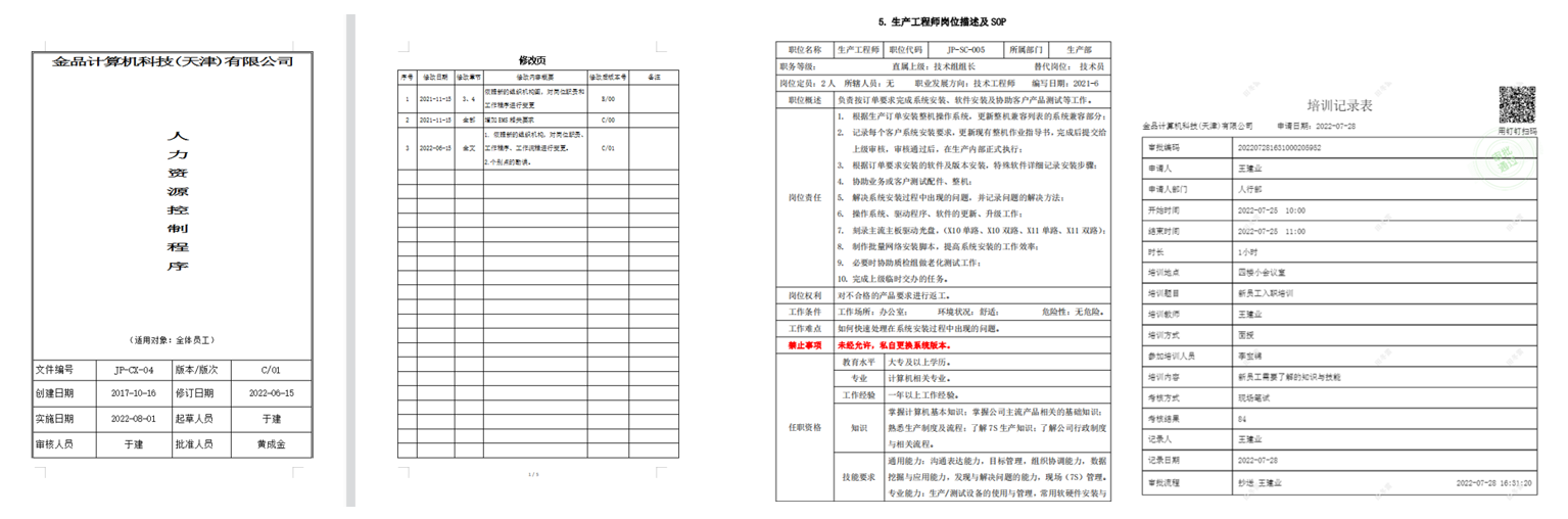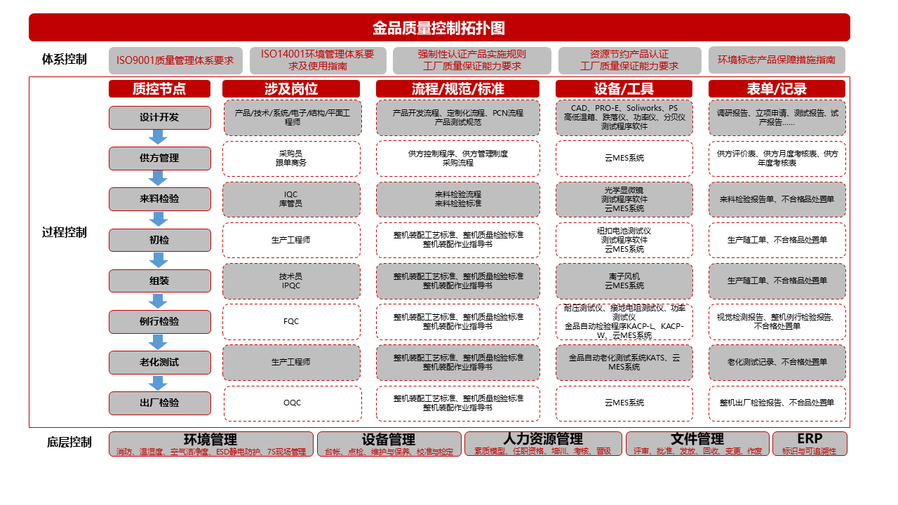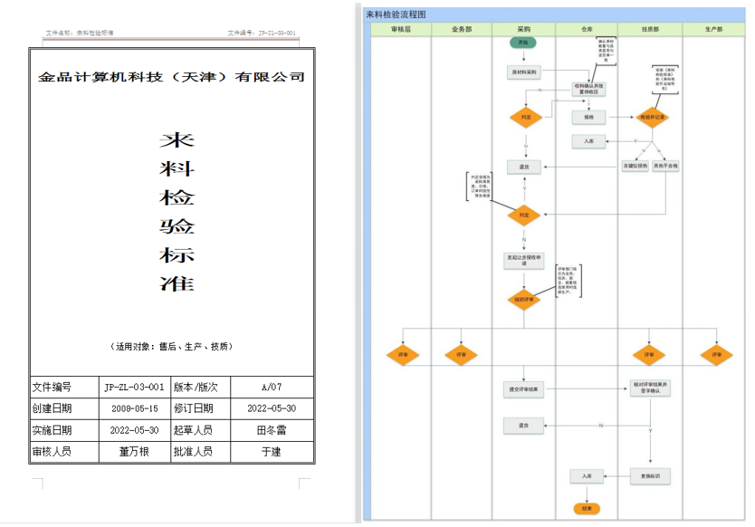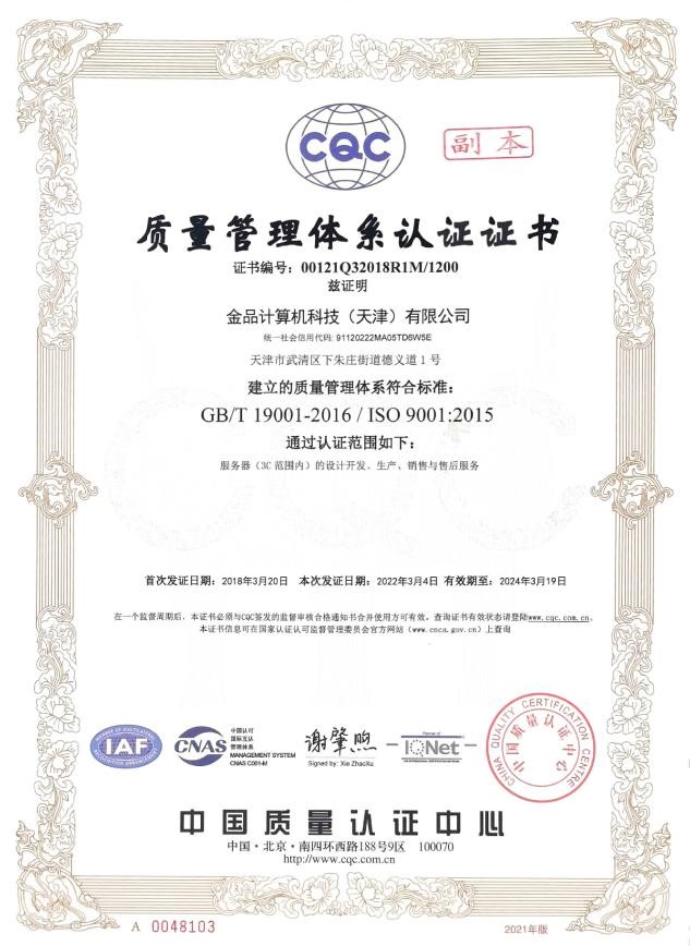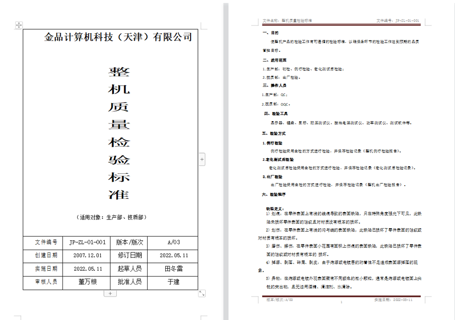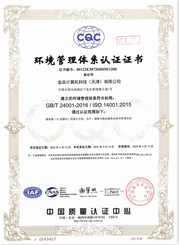 金品計(jì)算機(jī)科技(天津)有限公司(以下簡(jiǎn)稱為金品公司)先后通過(guò)了ISO9001質(zhì)量管理體系認(rèn)證、ISO14001環(huán)境管理體系認(rèn)證、產(chǎn)品CCC認(rèn)證、產(chǎn)品節(jié)能認(rèn)證。金品公司整個(gè)質(zhì)量和環(huán)境控制體系主要依據(jù)《GB/T 19001-2016/ISO 9001:2015質(zhì)量管理體系要求》、《GB/T24001-2016/ISO 14001:2015環(huán)境管理體系要求及使用指南 》、《CNCA-00C-005強(qiáng)制性認(rèn)證產(chǎn)品實(shí)施規(guī)則工廠質(zhì)量保證能力要求》、《CQCF002-2009資源節(jié)約產(chǎn)品認(rèn)證工廠質(zhì)量保證能力要求》等標(biāo)準(zhǔn)要求,結(jié)合企業(yè)自身的規(guī)模與運(yùn)營(yíng)模式,建立系統(tǒng)的質(zhì)量管理體系、環(huán)境管理體系,確保產(chǎn)品生產(chǎn)的一致性、可靠性、可追溯性。公司的體系認(rèn)證和產(chǎn)品認(rèn)證每年進(jìn)行內(nèi)部審核一次,接受外部審核三次(監(jiān)督審核),并不斷依據(jù)標(biāo)準(zhǔn)的變化、市場(chǎng)的發(fā)展、公司的調(diào)整對(duì)體系進(jìn)行完善,有效確保整個(gè)管理體系運(yùn)行的持續(xù)性、有效性與適宜性。