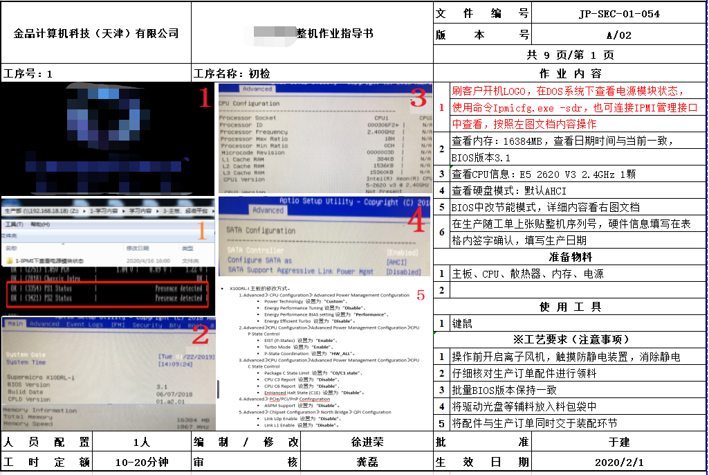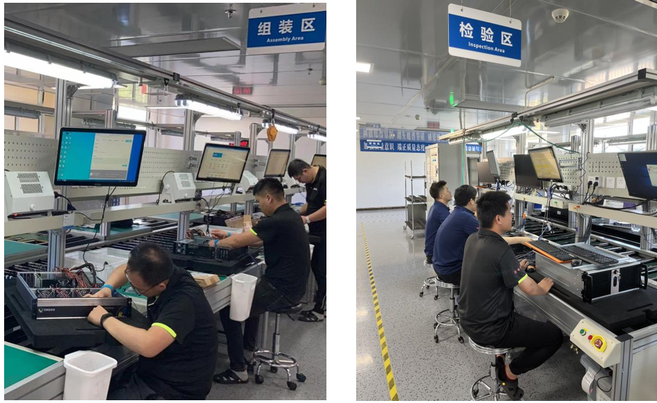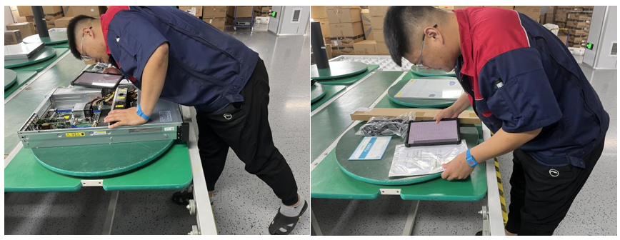 常規(guī)產(chǎn)品依照《配件按照作業(yè)指導(dǎo)書(shū)》、《內(nèi)部連線作業(yè)指導(dǎo)書(shū)》、《系統(tǒng)安裝作業(yè)指導(dǎo)書(shū)》等作業(yè)文件對(duì)產(chǎn)品的生產(chǎn)工藝進(jìn)行控制,通過(guò)自檢、互檢、巡檢等操作,確保裝配工藝的符合性。對(duì)于ODM/OEM客戶的定制產(chǎn)品,每款產(chǎn)品建立了獨(dú)立的《XX整機(jī)作業(yè)指導(dǎo)書(shū)》,鎖定產(chǎn)品物料與裝配工藝。生產(chǎn)過(guò)程中,通過(guò)《生產(chǎn)隨工單》對(duì)產(chǎn)品的整個(gè)生產(chǎn)過(guò)程進(jìn)行監(jiān)控與記錄,強(qiáng)化自檢與互檢流程,確保生產(chǎn)工藝標(biāo)準(zhǔn)化、一致化。