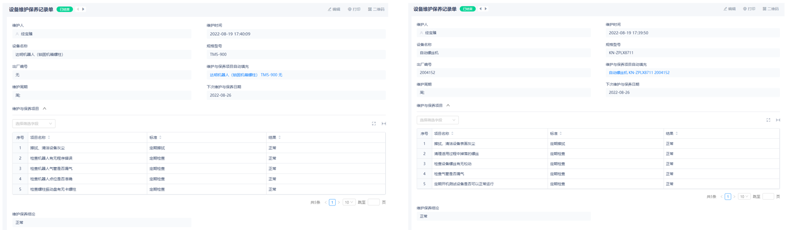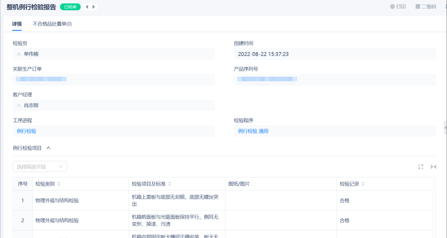 每臺(tái)設(shè)備具有唯一的產(chǎn)品序列號(hào)編碼與生產(chǎn)隨工單編碼,用于產(chǎn)品報(bào)修申請(qǐng)。通過(guò)該編碼在ERP系統(tǒng)內(nèi)可追溯其生產(chǎn)與檢驗(yàn)的全過(guò)程,滿足故障報(bào)修的處理(正向追溯)與批量質(zhì)量事故的處理(逆向追溯)追溯要求。