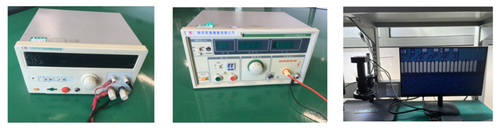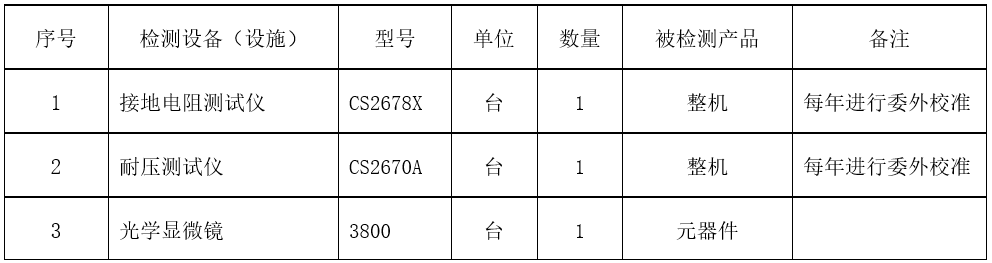 公司目前主要檢驗(yàn)設(shè)備3臺(tái)(耐壓測(cè)試儀1臺(tái)、接地電阻測(cè)試儀1臺(tái)、光學(xué)顯微鏡1臺(tái)),3臺(tái)檢驗(yàn)設(shè)備的功能主要為: