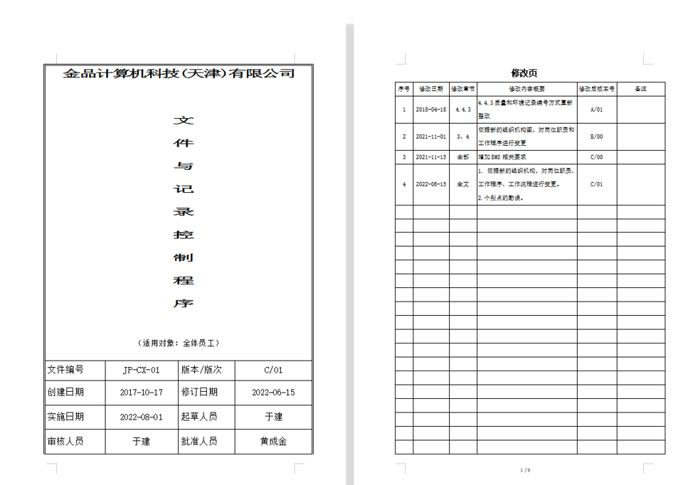 依照ISO9001質(zhì)量管理和ISO14001環(huán)境管理標(biāo)準(zhǔn),公司已建立《文件與記錄控制程序》,對(duì)公司文件與質(zhì)量和環(huán)境記錄實(shí)施標(biāo)準(zhǔn)化管理工作。文件控制是對(duì)公司質(zhì)量環(huán)境管理體系所要求的文件的編寫(xiě)、評(píng)審、批準(zhǔn)、發(fā)放、使用、更改、再次批準(zhǔn)、標(biāo)識(shí)、回收和作廢等過(guò)程進(jìn)行控制,以確保公司各部門(mén)和工作場(chǎng)所使用現(xiàn)行有效的文件和資料(即適用版本),防止使用作廢的文件,達(dá)到保持公司質(zhì)量和環(huán)境管理體系運(yùn)行的符合性的目的。