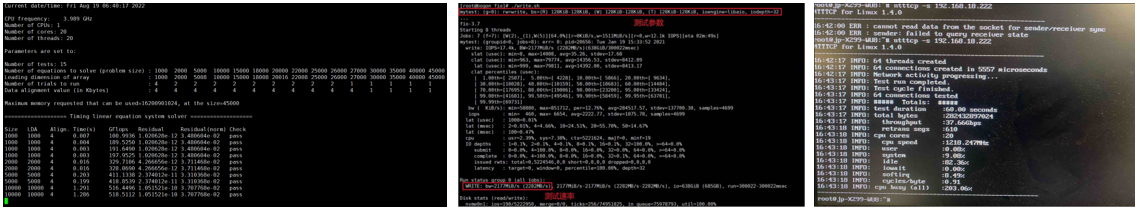 在性能測(cè)試方面,主要對(duì)CPU、內(nèi)存、硬盤(pán)、網(wǎng)卡、顯卡等進(jìn)行測(cè)試,通過(guò)使用STRESS工具測(cè)試CPU的運(yùn)算能力,使用FIO、iozone工具對(duì)硬盤(pán)進(jìn)行讀寫(xiě)性能測(cè)試、使用iperf、netperf工具對(duì)網(wǎng)卡進(jìn)行傳輸測(cè)試,通過(guò)GPUtest對(duì)顯卡進(jìn)行性能測(cè)試等,對(duì)服務(wù)器的各組件進(jìn)行性能測(cè)試。