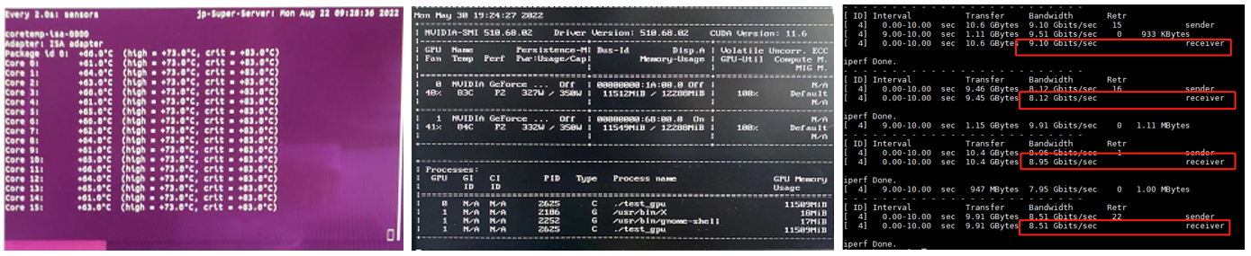 在滿負(fù)載測(cè)試方面,我們會(huì)對(duì)CPU、內(nèi)存、硬盤(pán)、顯卡、RAID卡、網(wǎng)卡等進(jìn)行滿負(fù)載性能測(cè)試,主要包括使用STRESS、memtest、FIO、iozone、iperf、netperf、CUDA、spec、GPUbrun等工具,使用STRESS、memtest對(duì)內(nèi)存進(jìn)行至少48小時(shí)的壓力測(cè)試,使用STRESS、spec對(duì)CPU進(jìn)行性能壓力測(cè)試、使用FIO、iozone對(duì)硬盤(pán)進(jìn)行讀寫(xiě)及隨機(jī)讀寫(xiě)性能測(cè)試、使用netperf、iperf對(duì)網(wǎng)卡進(jìn)行傳輸測(cè)試、通過(guò)安裝CUDA和使用GPUBrun對(duì)顯卡進(jìn)行性能及壓力測(cè)試,通過(guò)以上工具和方法對(duì)服務(wù)器的整機(jī)進(jìn)行可靠性測(cè)試,一次來(lái)驗(yàn)證服務(wù)器在滿負(fù)載下的可靠性是否達(dá)標(biāo)。
